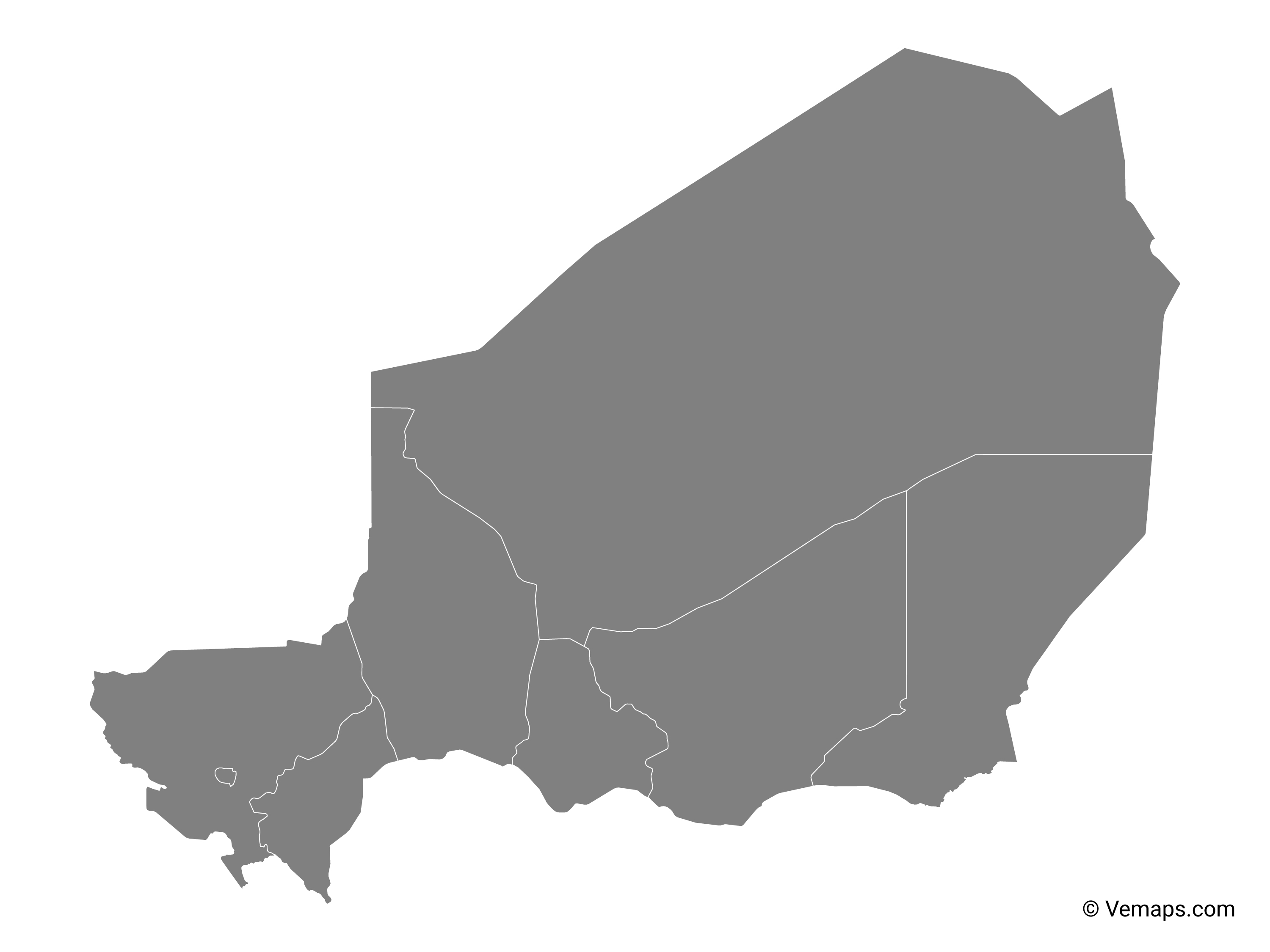 Fully editable Grey Map of Niger with Regions. Comes in AI, EPS, PDF, SVG, JPG and PNG file formats.